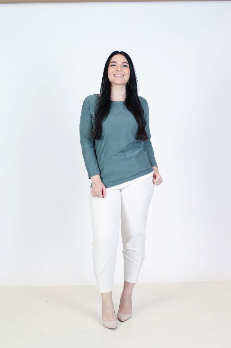 חולצה חורפית עשויה בד נעים ורך, טקסטורת זיג זג על הבד, מפתח צוואר עגול.